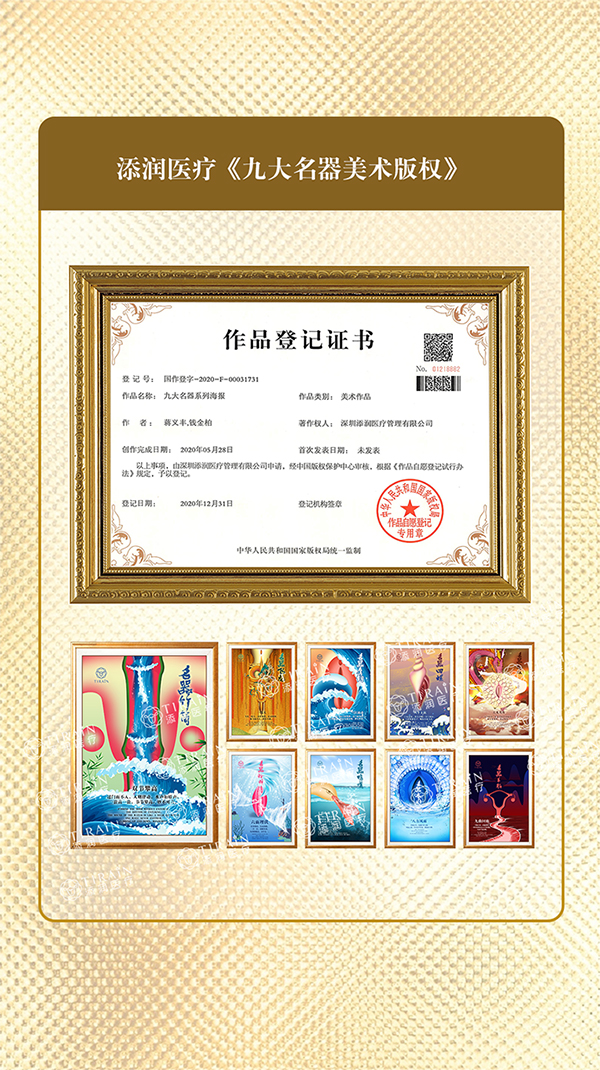 添潤醫療“九大名器掛畫(huà)系列”是添潤生殖原創(chuàng )系列,已通過(guò)中國版權保護中心審核,獲得國家版權局頒發(fā)的證書(shū),正式受到國家知識產(chǎn)權保護。未來(lái),添潤也將繼續推進(jìn)一系列原創(chuàng )作品,同時(shí)提升集團產(chǎn)權保護。